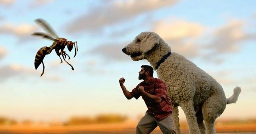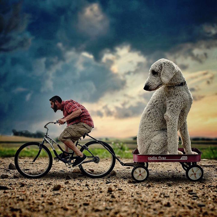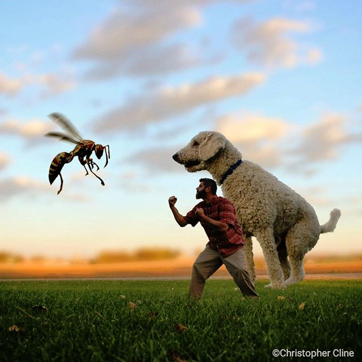 Photographer Christopher Cline and his Goldendoodle Juji (pronounced Joo-ji) are a match made in Photoshop heaven. After moving from Virginia to Minnesota a few years ago, the artist was feeling homesick and “sliding into a sad place in life.” Then, his girlfriend Christine brought home Juji. “I wasn’t exactly open to getting a dog,” Cline told Mrs. Sizzle, “but I immediately fell in love with him. He has turned my life completely around and we are now absolutely inseparable. I have found a new outlook on life and in my artwork and I owe it all to him.” After Juji came into his life, Cline began expressing himself through Photoshop. He’d take photos of himself and Juji and later alter them to make it look as though his canine pal was a giant. “I just wanted to share a little of our adventures together,” Cline explains, adding that he wants his edits to have a “kids’ book feel.”
